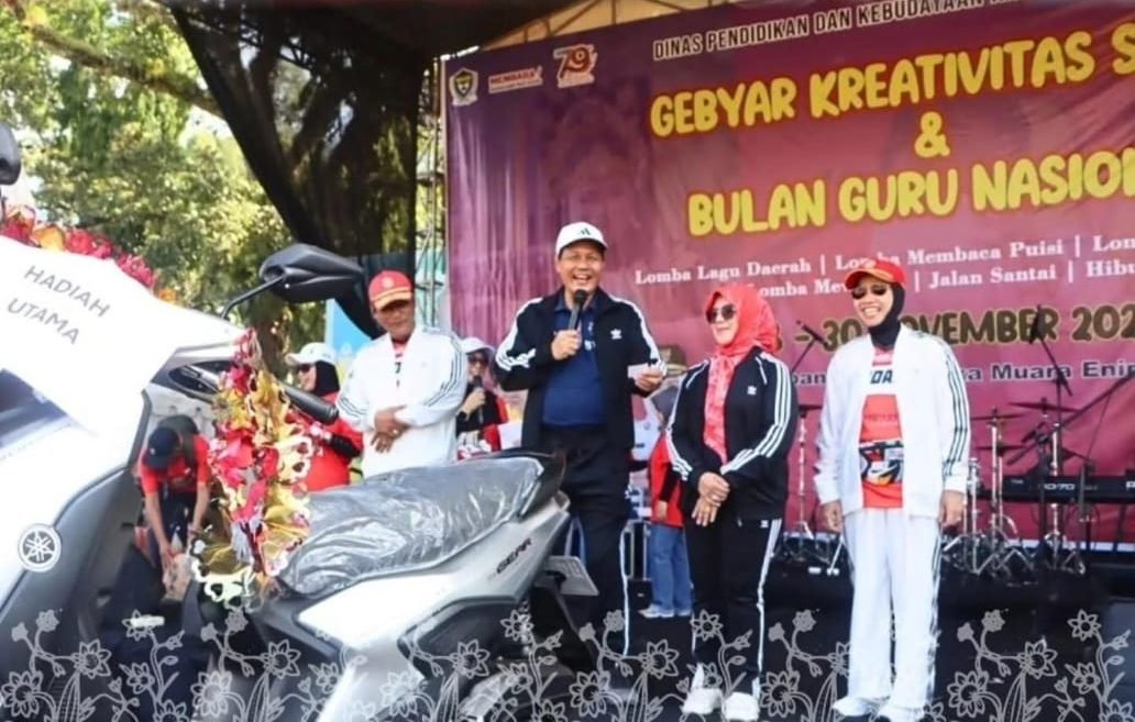 RIMAUNEWS.CO.ID, Muara Enim – Bupati Muara Enim, H. Edison, S.H., M.Hum., menyerahkan 92 kendaraan operasional kepada para kepala sekolah dalam momentum Hari Guru Nasional. Bantuan tersebut terdiri dari 80 unit sepeda motor untuk kepala sekolah SD dan 12 unit mobil untuk kepala sekolah SMP. Penyerahan dilakukan pada puncak acara Gebyar Kreativitas Siswa dan Bulan Guru Nasional di Lapangan Merdeka Muara Enim, Minggu (30/11).