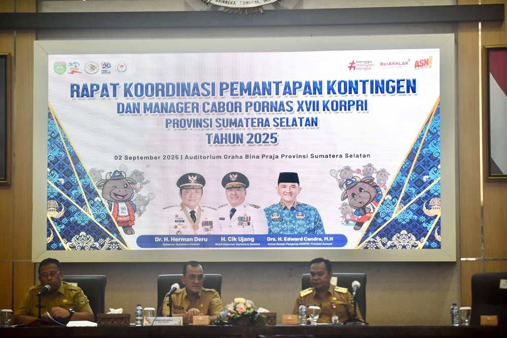 RIMAUNEWS.CO.ID, Palembang – Provinsi Sumatera Selatan (Sumsel) terus mematangkan persiapan sebagai tuan rumah Pekan Olahraga Nasional (Pornas) XVII Korps Pegawai Republik Indonesia (Korpri) Tahun 2025. Sekretaris Daerah (Sekda) Sumsel, Drs. H. Edward Candra MH, memimpin rapat koordinasi bersama kontingen dan manajer cabang olahraga (cabor) di Auditorium Graha Bina Praja, Selasa (2/9/2025).