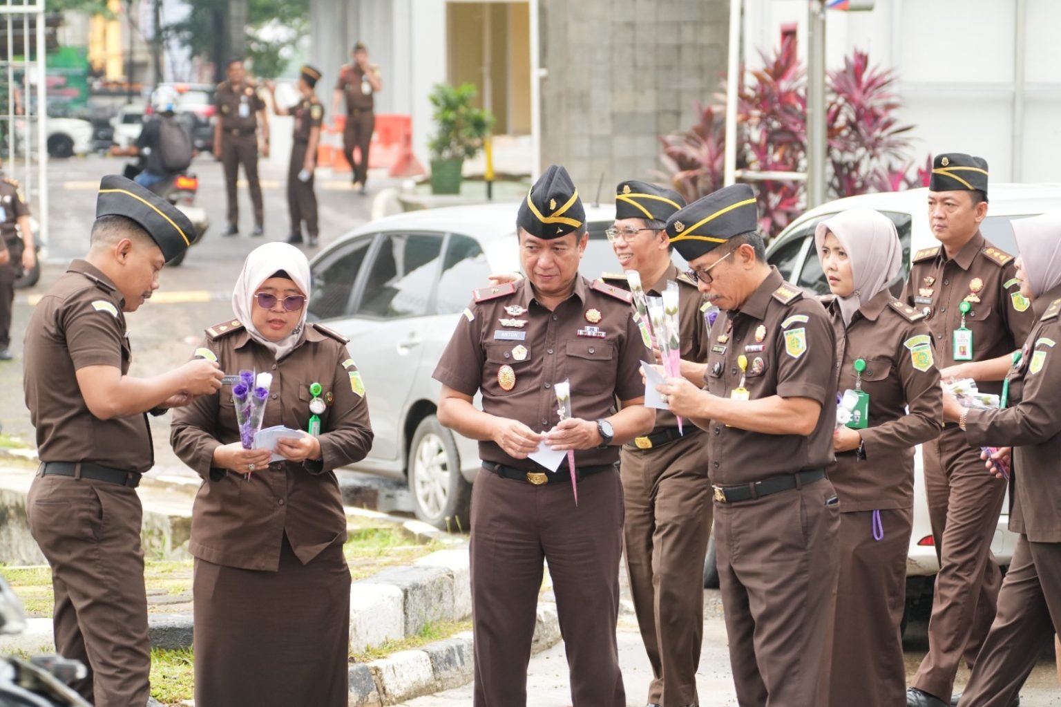 Pembagian bunga dan stiker dilakukan oleh Wakajati Sumsel Anton Delianto SH MH dan para pejabat Kejati Sumsel, Selasa (9/12/2025).